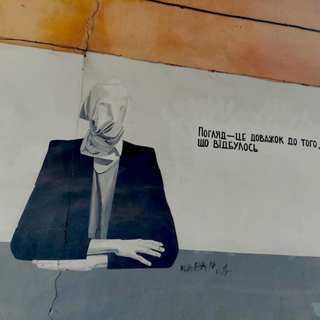 A portrait-led walk with Gamlet Zinkivskyi through his city. The photographs place him in front of his own pieces—aphorisms and spare figures stretched across courtyards, doors, transformer boxes and long walls. Between these portraits are fragments of Kharkiv itself: stairwells, facades, shop signs, and street textures that hold a city’s pulse when headlines grow loud.